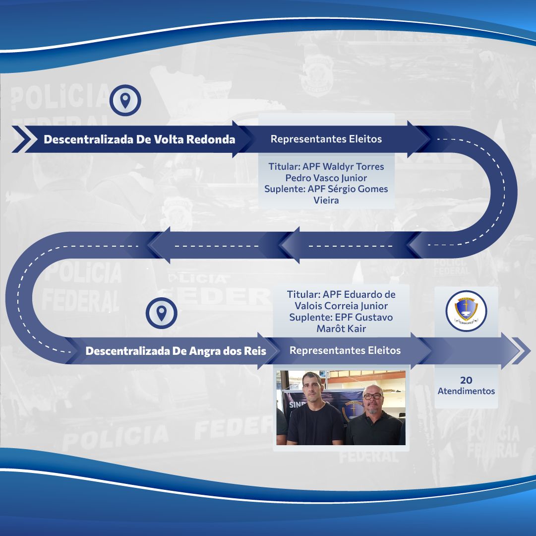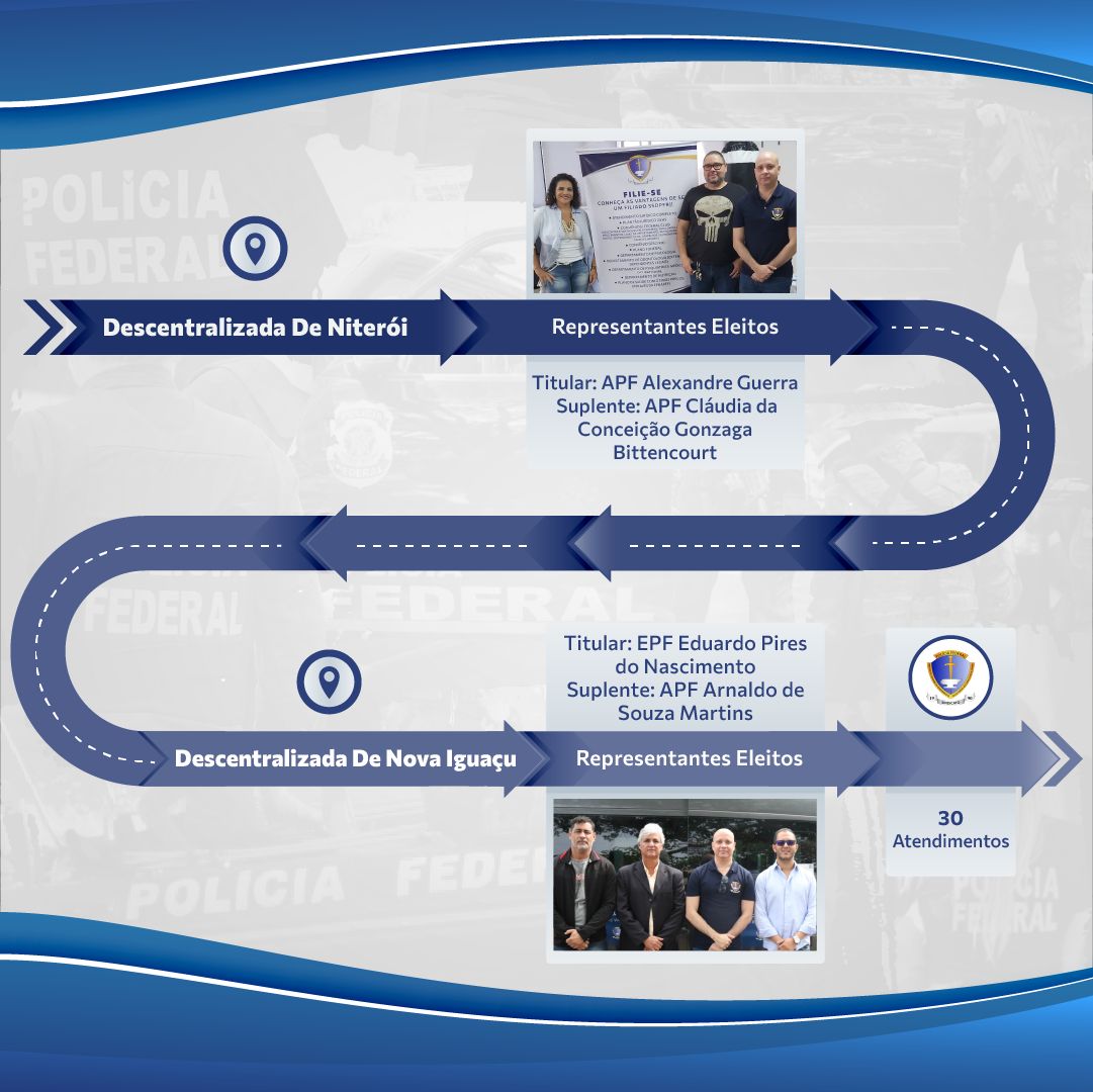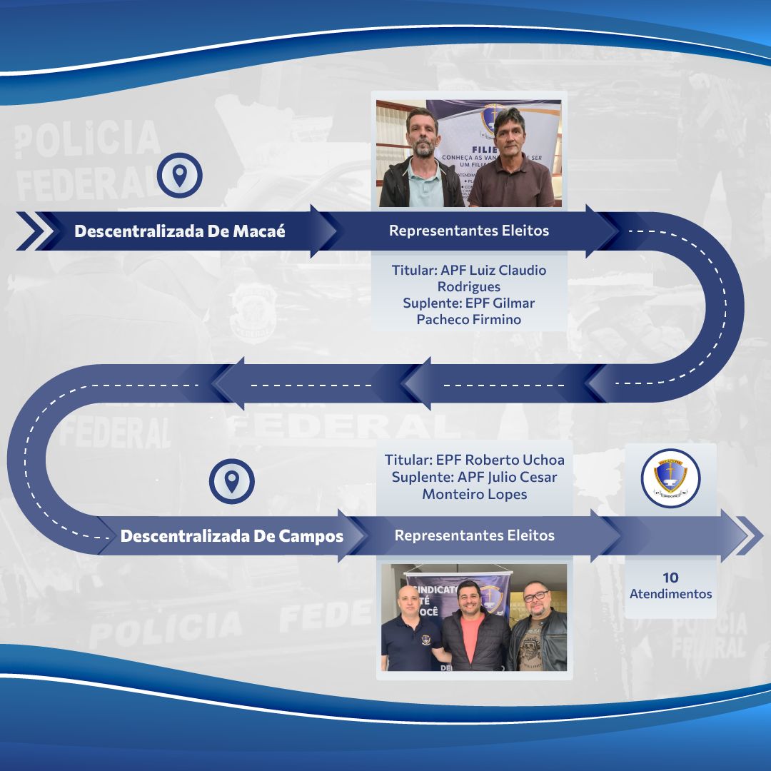 Em Macaé, o representante sindical titular eleito para mais três anos é o APF Luiz Claudio Rodrigues e o suplente é o EPF Gilmar Pacheco Firmino. Em Campos, o titular é o EPF Roberto Uchoa e o suplente é o APF Julio Cesar Monteiro Lopes. Em Niterói, o APF Alexandre Guerra foi reeleito representante sindical titular. Como suplente foi eleita a APF Cláudia da Conceição Gonzaga Bittencourt.