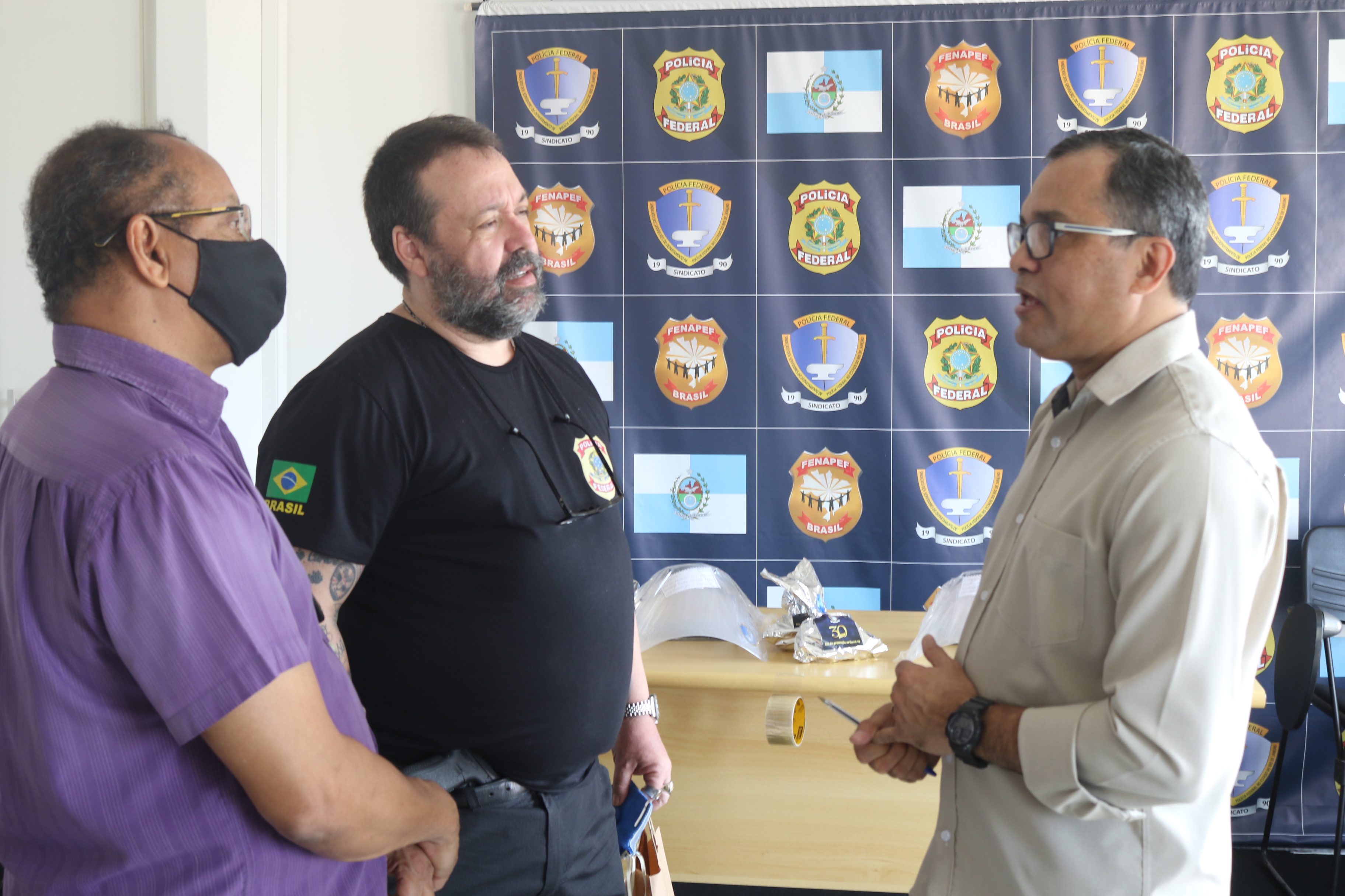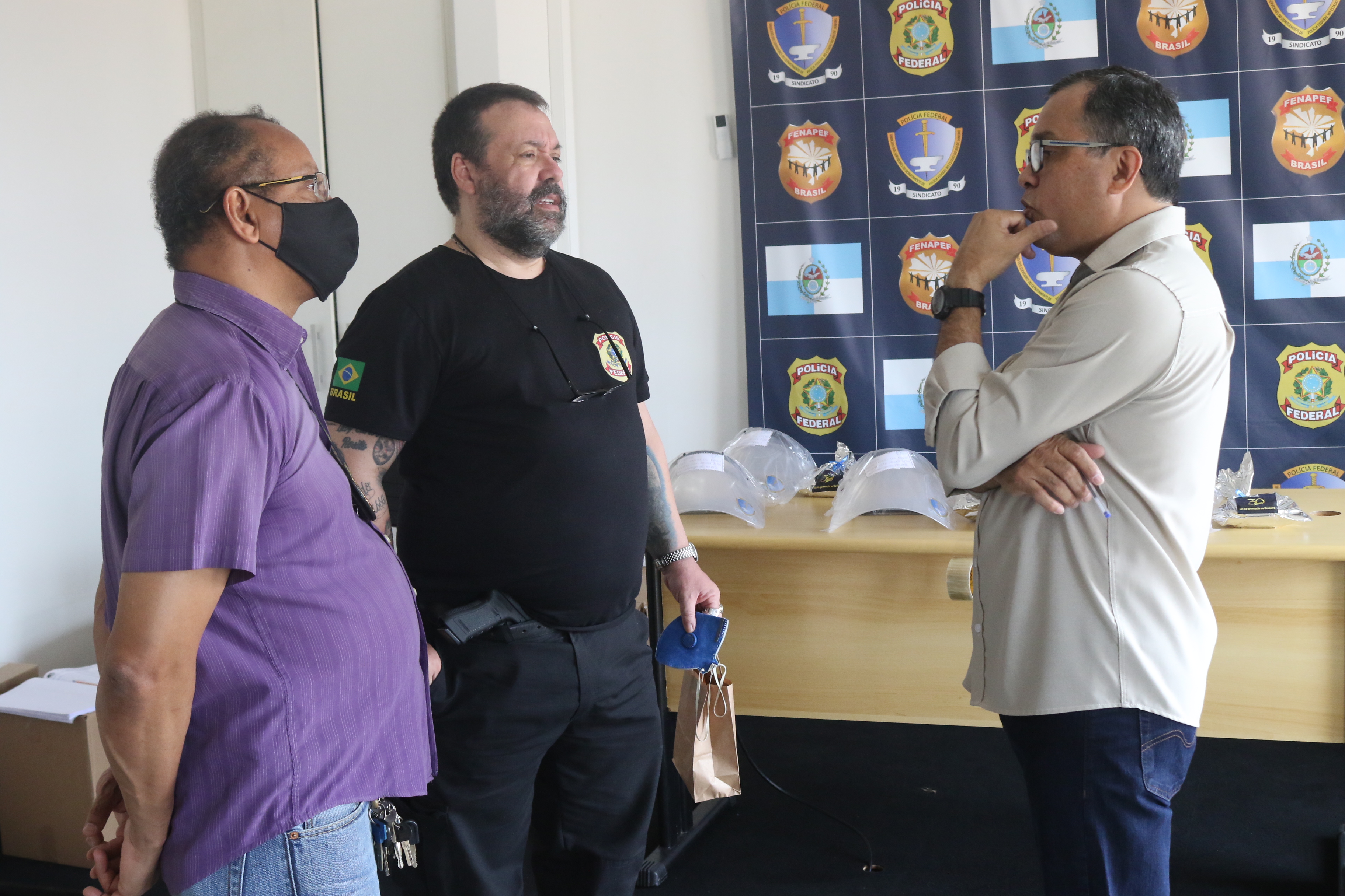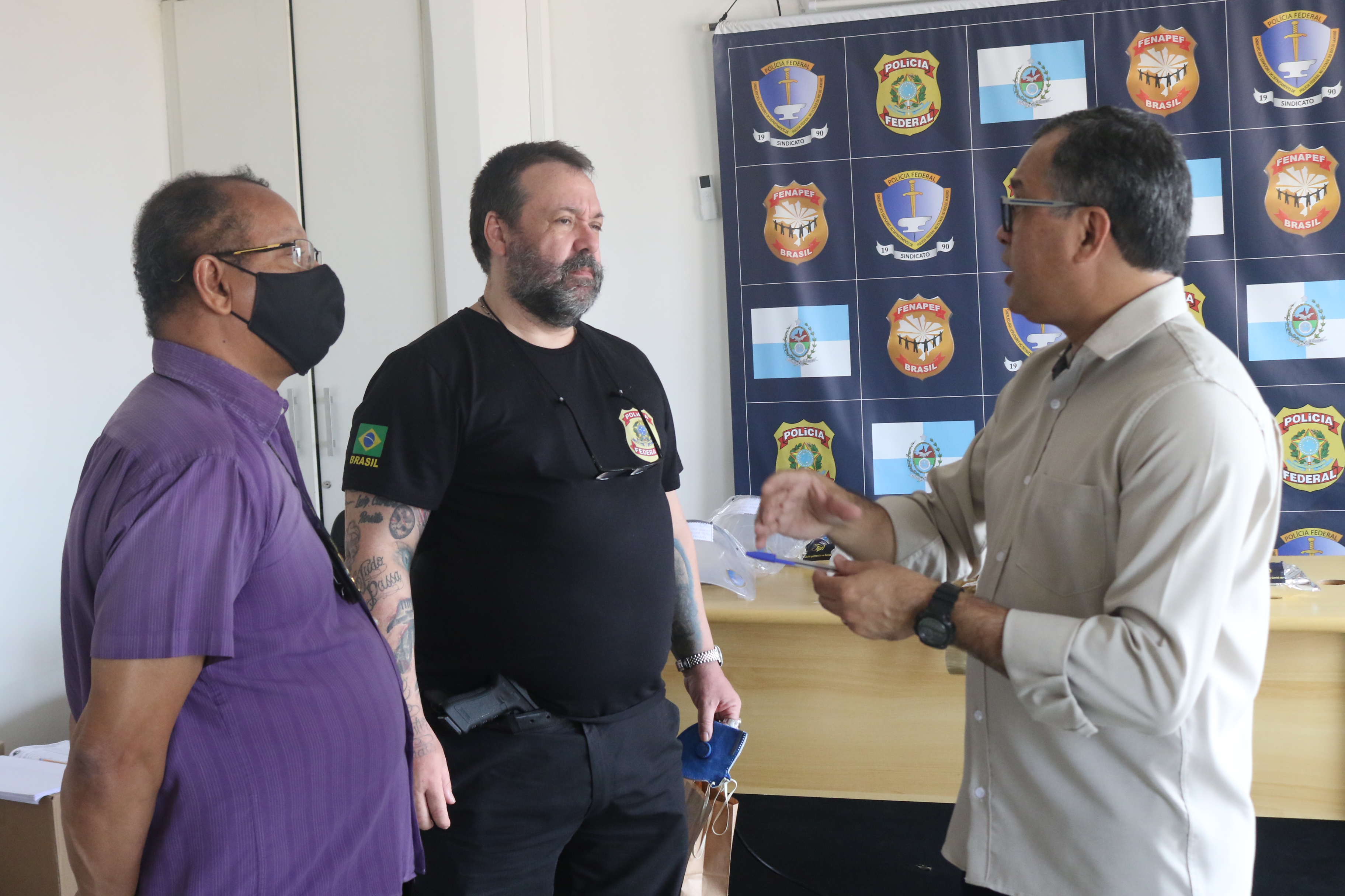 O presidente do SSDPFRJ, Gladiston Silva, entregou face shields e kits anti-Covid aos associados Marconi e Gustavo Accioly, na tarde desta terça-feira (08/09), na sede do Sindicato. Ambos atuam na Deldia, na linha de frente do trabalho policial externo. O encontro rendeu uma breve conversa entre os três.