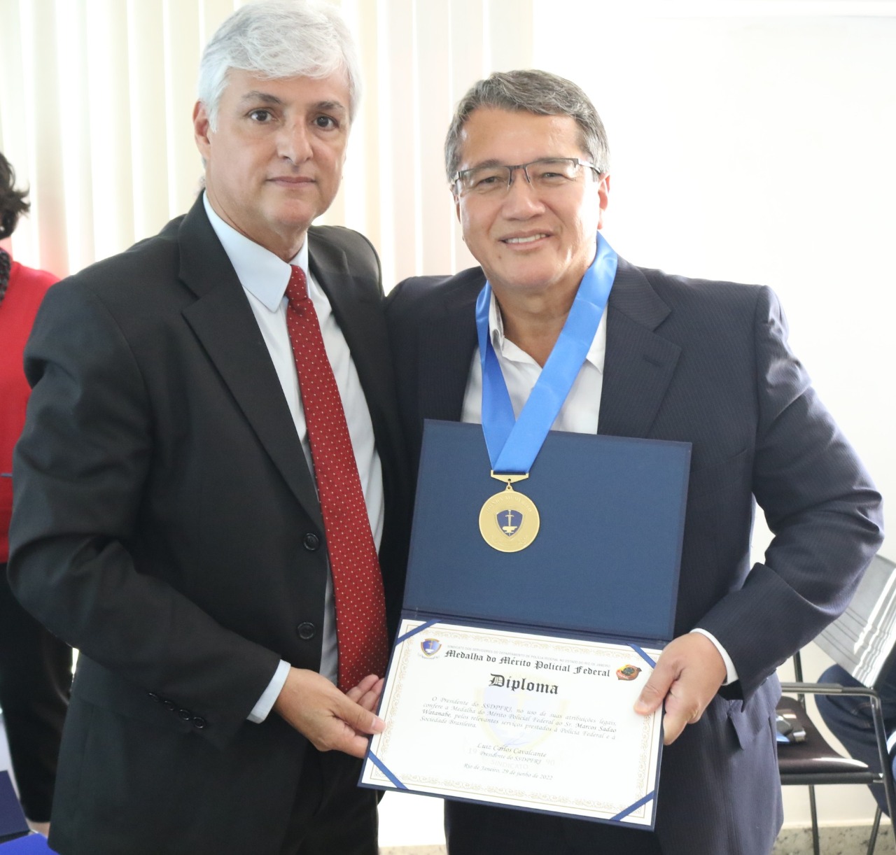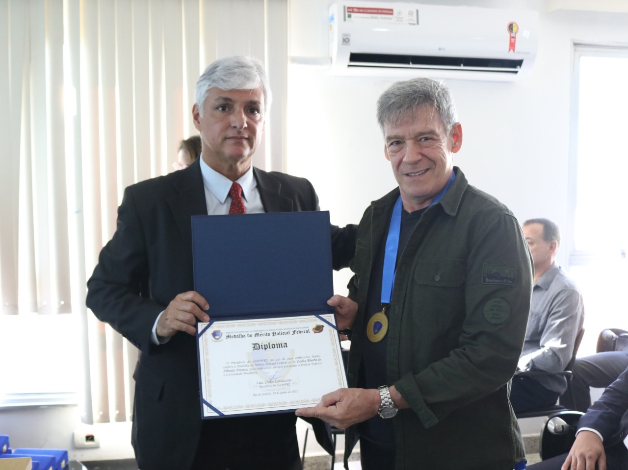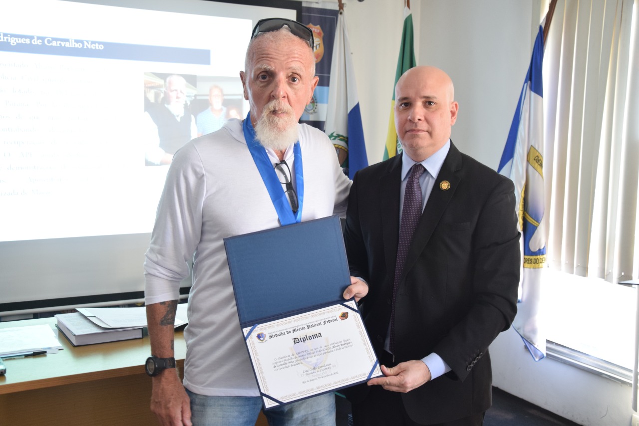 Em AGE realizada para um auditório lotado na sede do SSDPFRJ, na Praça Mauá, nesta quarta-feira (29/06), o Sindicato abordou a situação da reestruturação salarial dos servidores da PF e a recente aprovação da MP 1080/21 que garante o subsídio pela PF do plano de saúde dos policiais da ativa e aposentados e a remuneração do sobreaviso policial. Também homenageou cerca de vinte servidores aposentados com a Medalha do Mérito Policial Federal, comenda máxima da instituição criada pela Diretoria Novo Tempo na primeira gestão do presidente Luiz Carlos Cavalcante (2015-2018). A AGE foi conduzida pelo presidente Luiz Carlos Cavalcante e pelo secretário-geral Iranilmo Lopes.