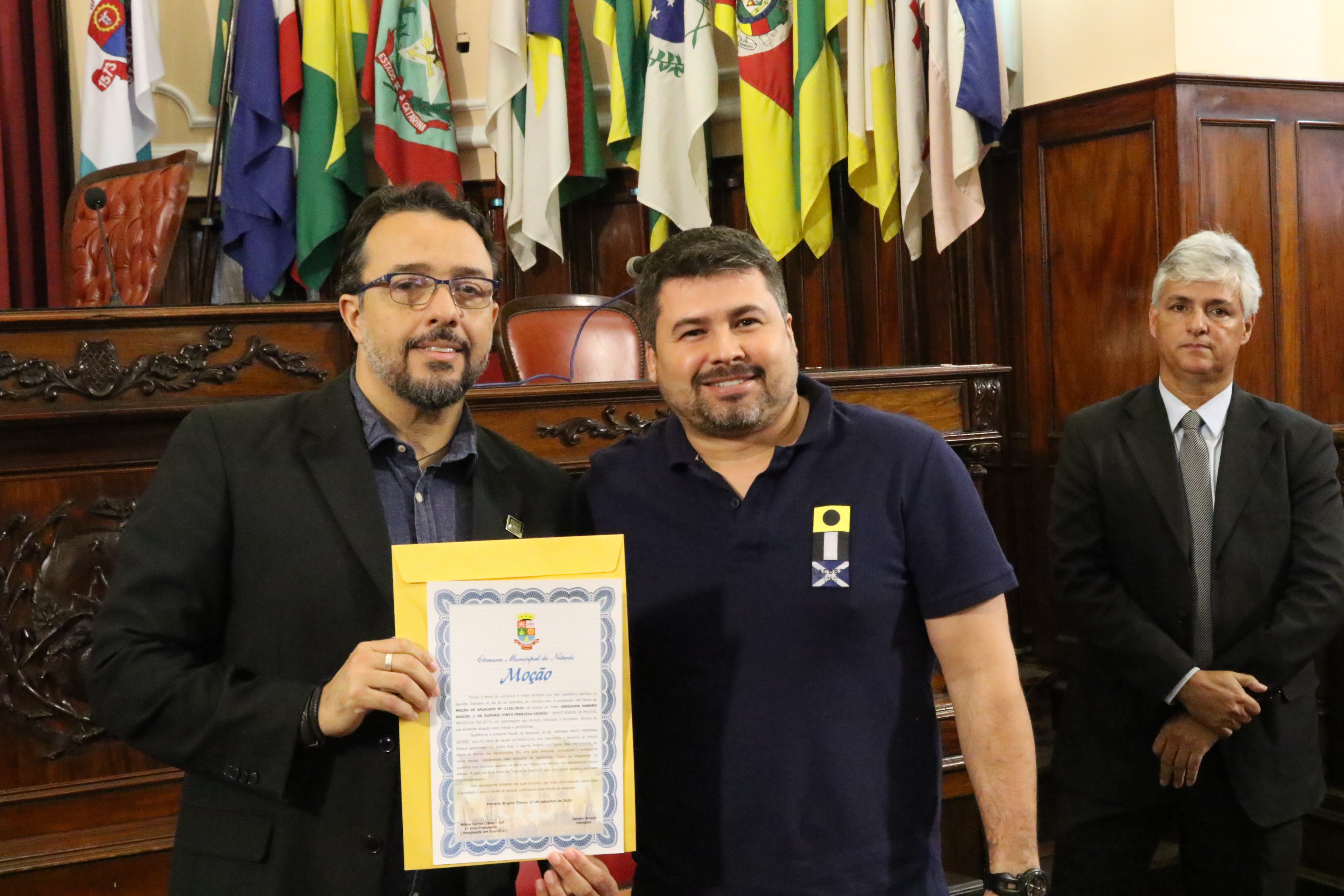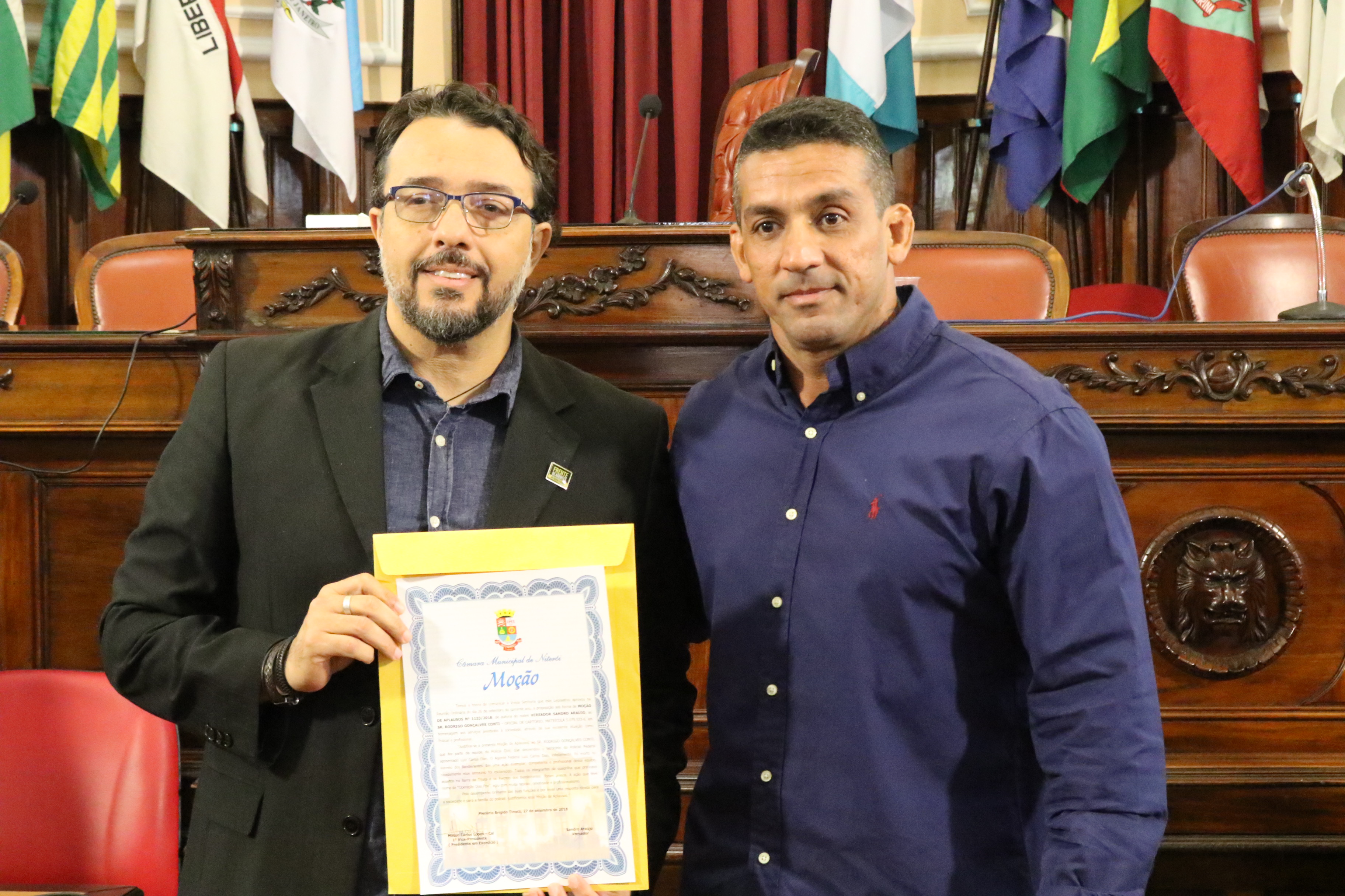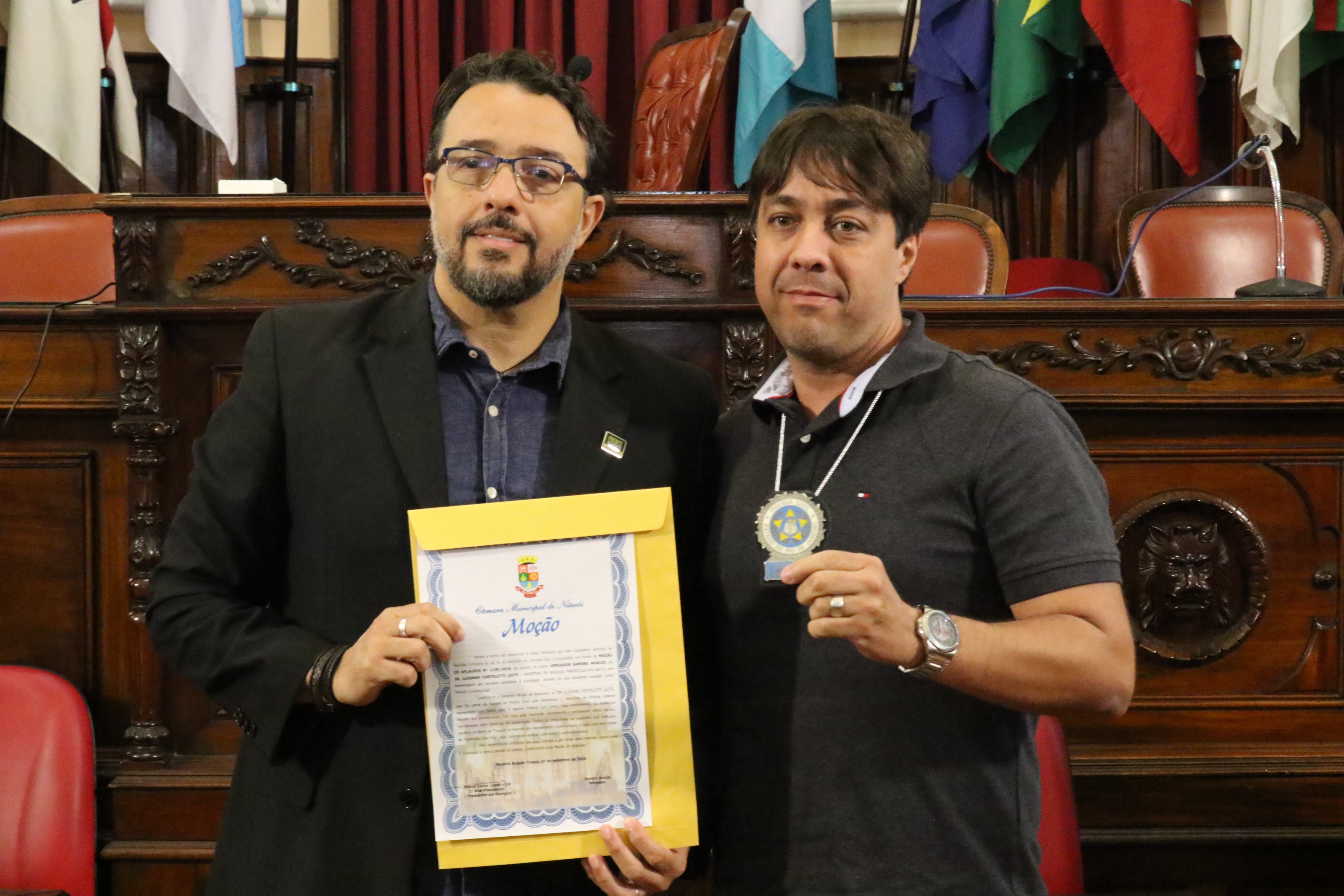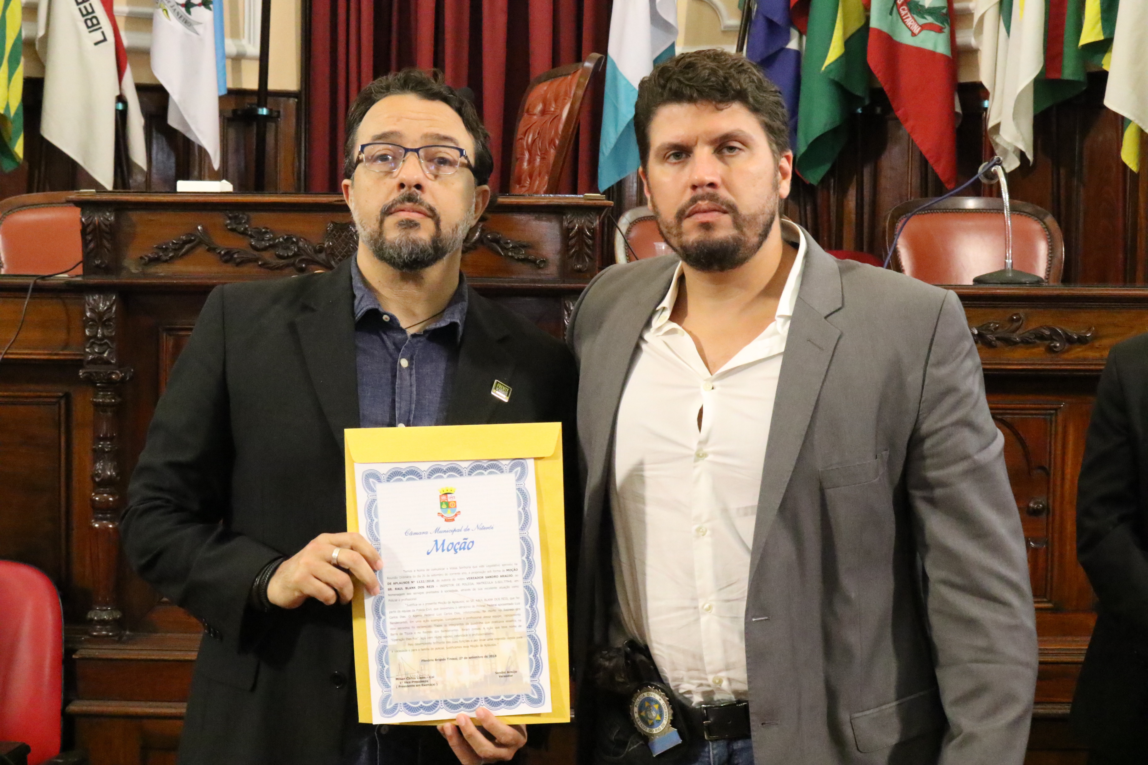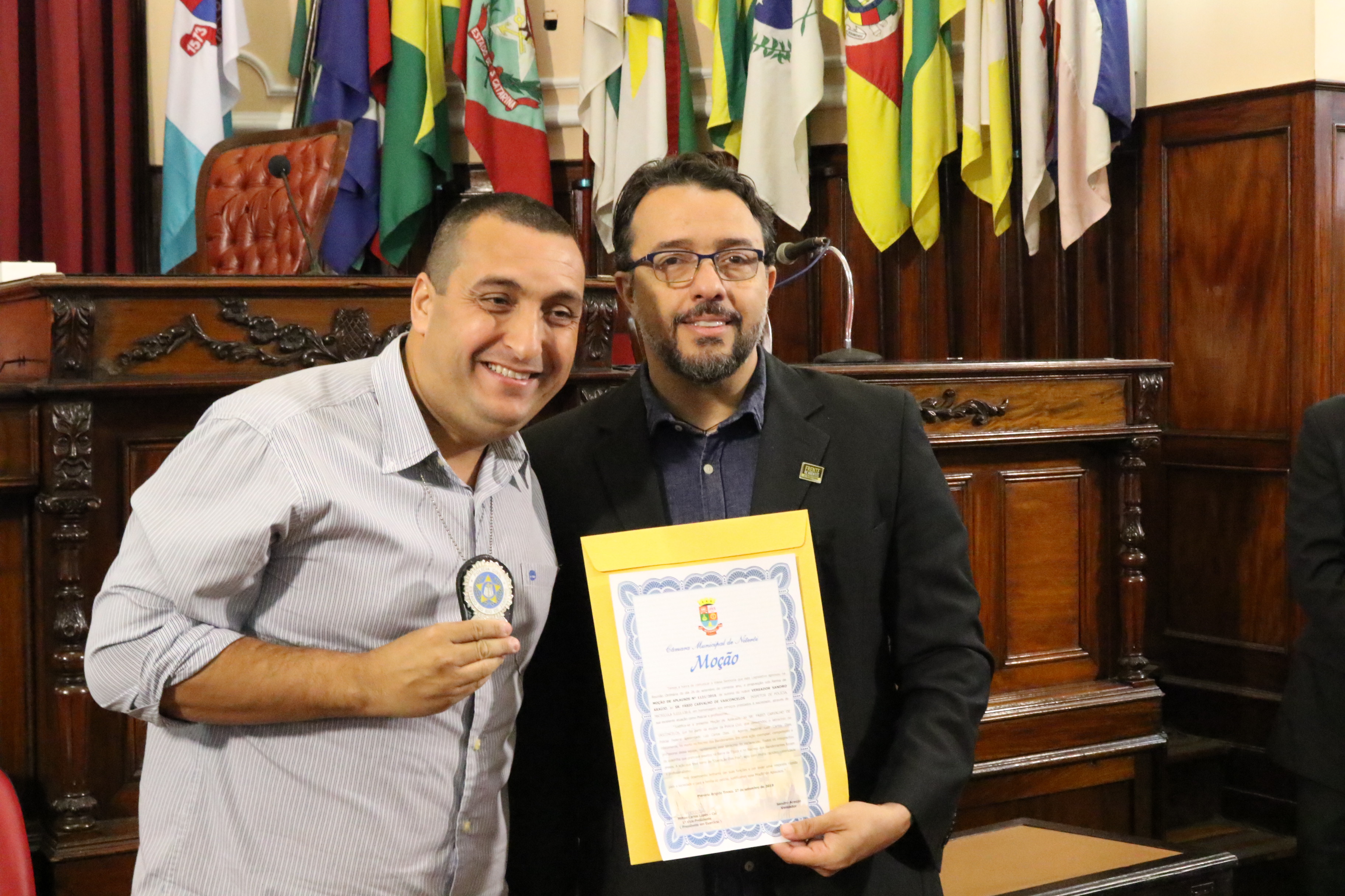 Por iniciativa do Vereador e APF, Sandro Araújo, a Câmara de Vereadores de Niterói realizou hoje (05/10), às 11h, uma sessão no plenário da casa legislativa, na qual a equipe de policiais civis da Divisão de Homicídios foi condecorada com a honraria “Moção de Aplausos” por ter desvendado com celeridade e profissionalismo o latrocínio sofrido pelo APF Luiz Carlos Dias. “Eu parabenizo esses policiais que estão todos os dias nas ruas combatendo o crime. Quero uma salva de palmas para todos nós, policiais”, abriu assim a sessão, o Vereador, Sandro Araújo.