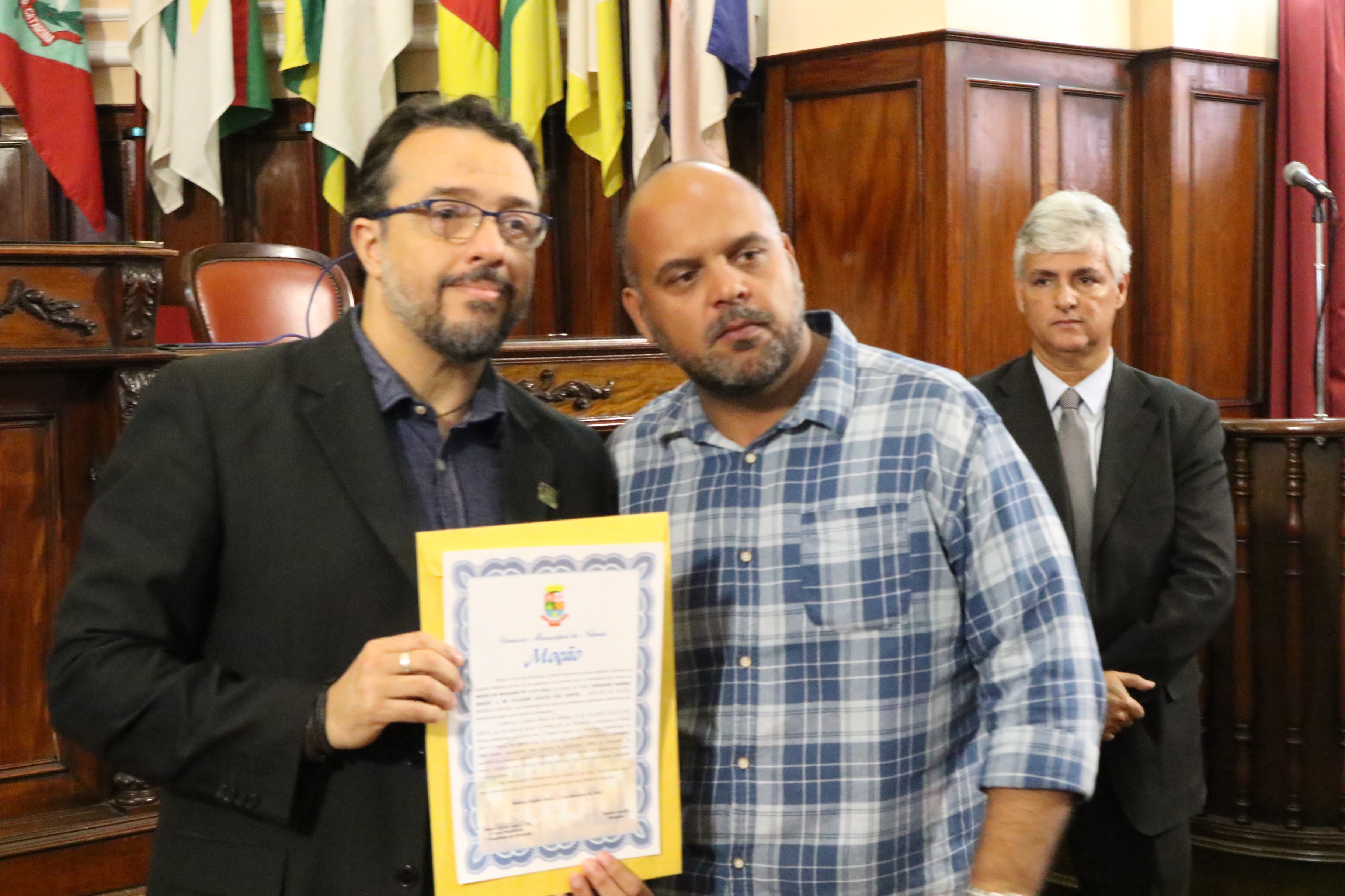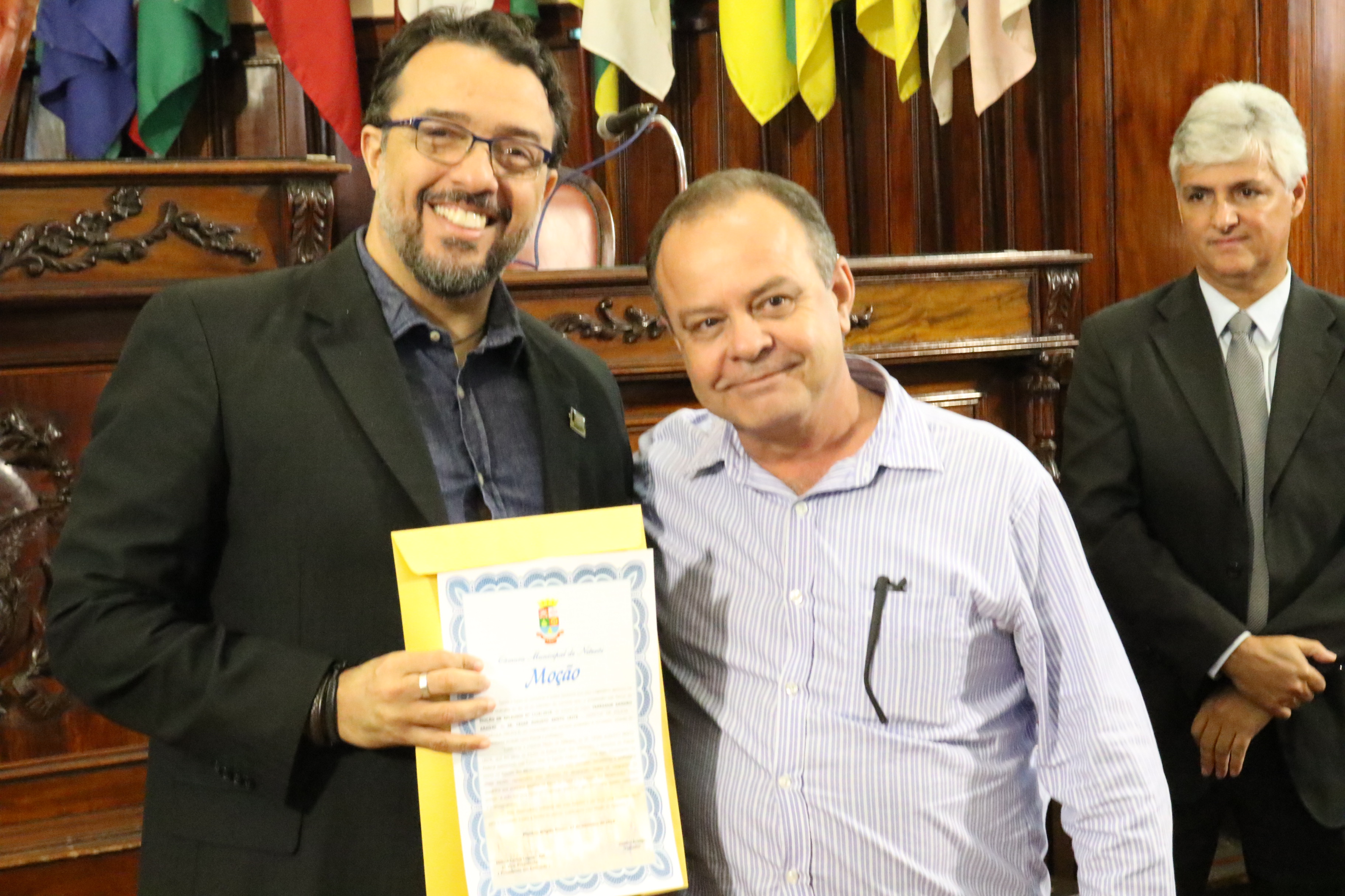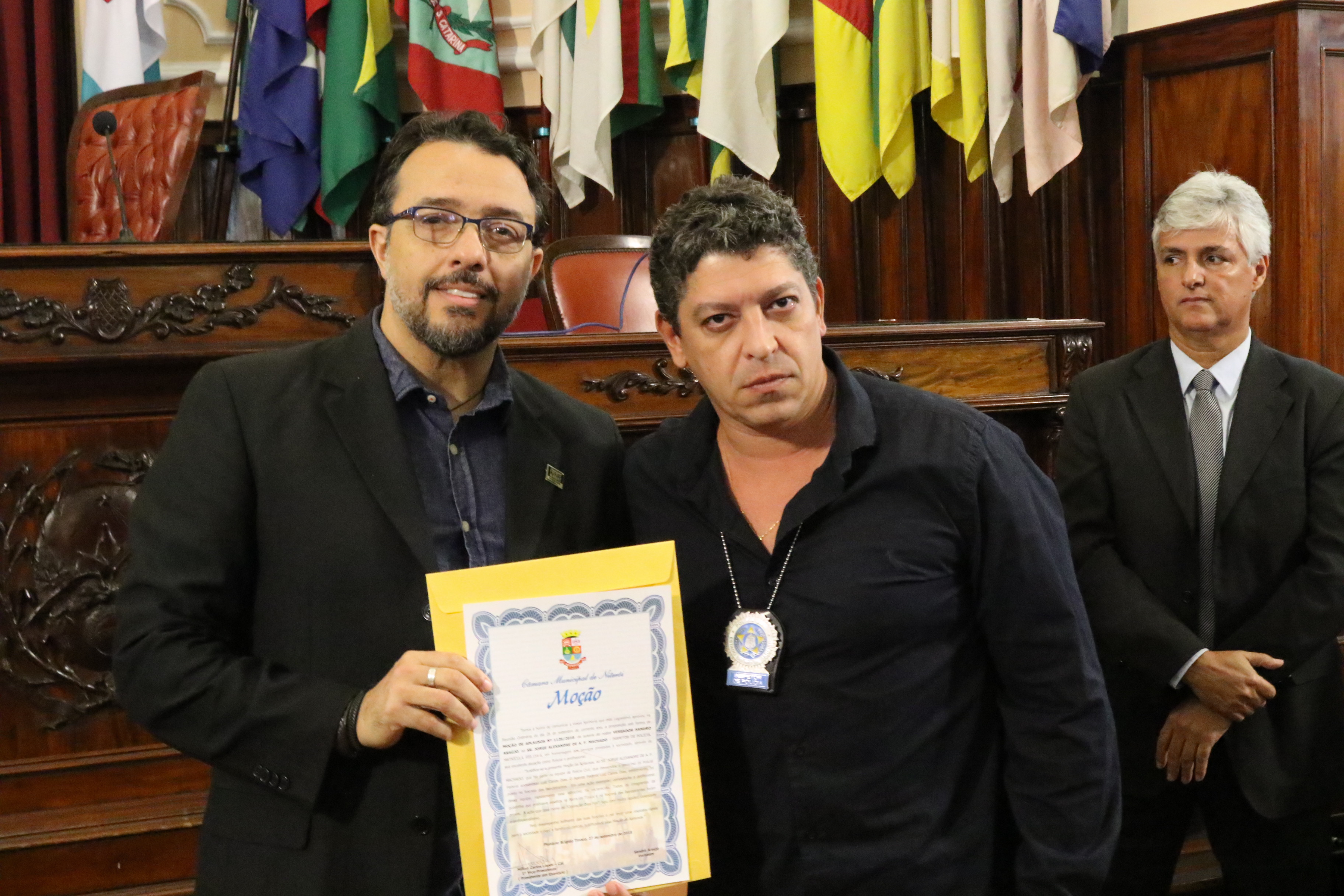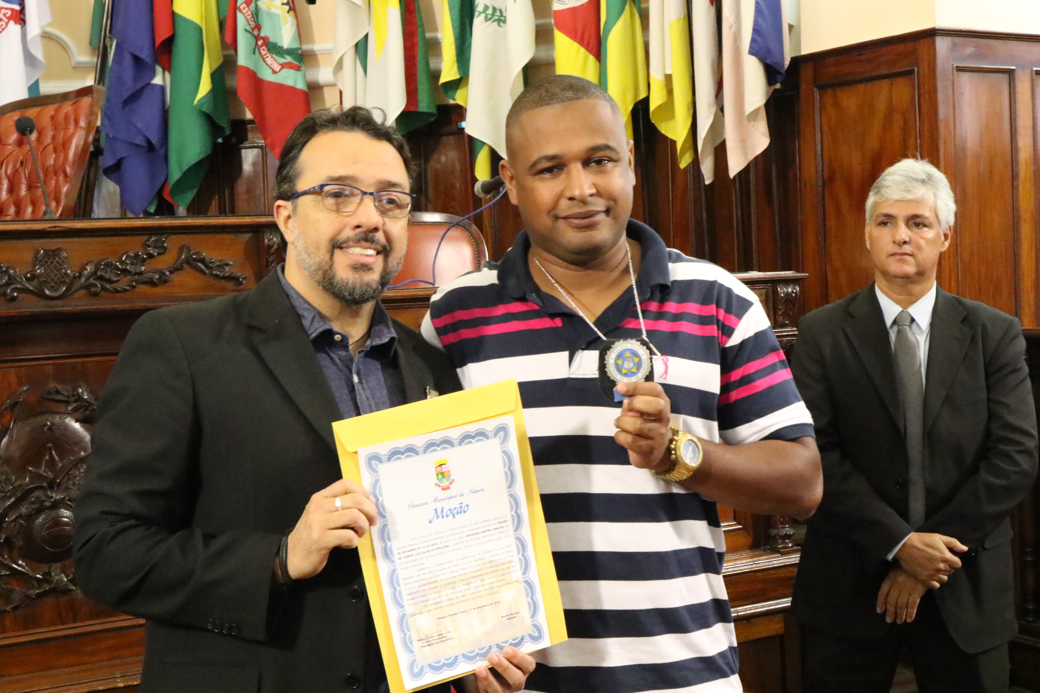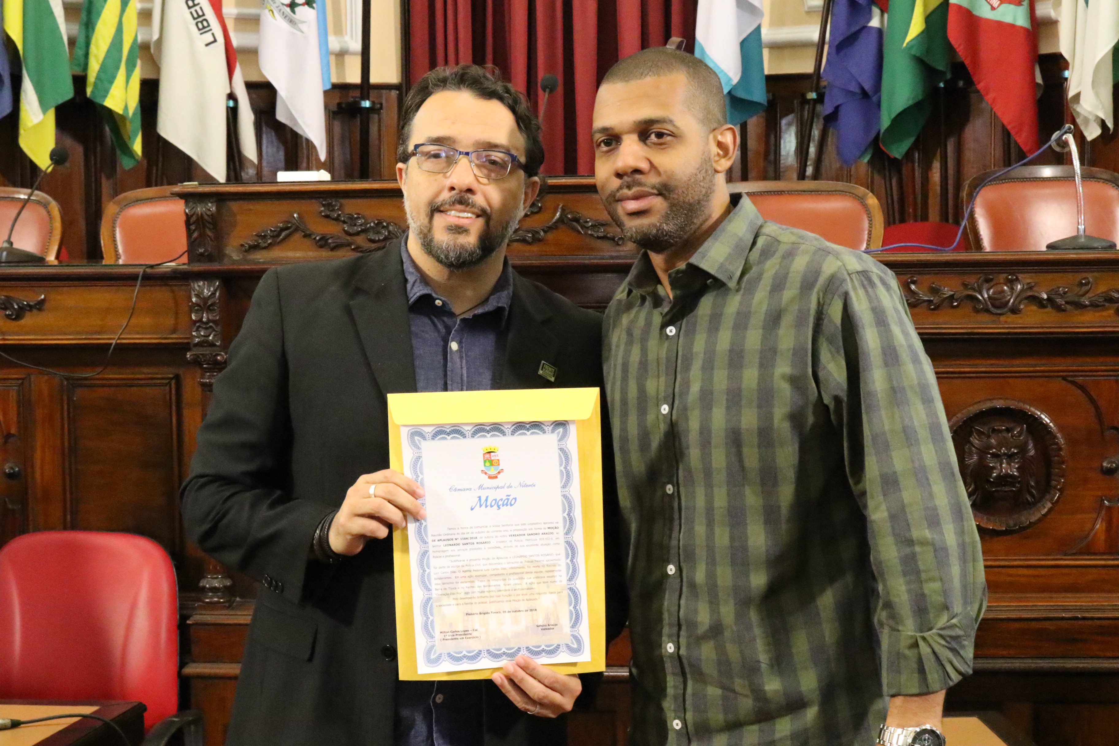 Por iniciativa do Vereador e APF, Sandro Araújo, a Câmara de Vereadores de Niterói realizou hoje (05/10), às 11h, uma sessão no plenário da casa legislativa, na qual a equipe de policiais civis da Divisão de Homicídios foi condecorada com a honraria “Moção de Aplausos” por ter desvendado com celeridade e profissionalismo o latrocínio sofrido pelo APF Luiz Carlos Dias. “Eu parabenizo esses policiais que estão todos os dias nas ruas combatendo o crime. Quero uma salva de palmas para todos nós, policiais”, abriu assim a sessão, o Vereador, Sandro Araújo.